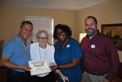 The most recent Certificate of Accomplishment Ceremony was held Monday, August 20, 2018, in the main lobby of independent living. Residents were able to reconnect with the therapy and nursing staff that helped them transition back home. It was a great opportunity to reflect on their progress while enjoying drinks, fruit, and an epic cheese ball handcrafted for the event by Chef James and the kitchen staff All Treemont residents are invited to attend with ceremonies being held throughout the year.